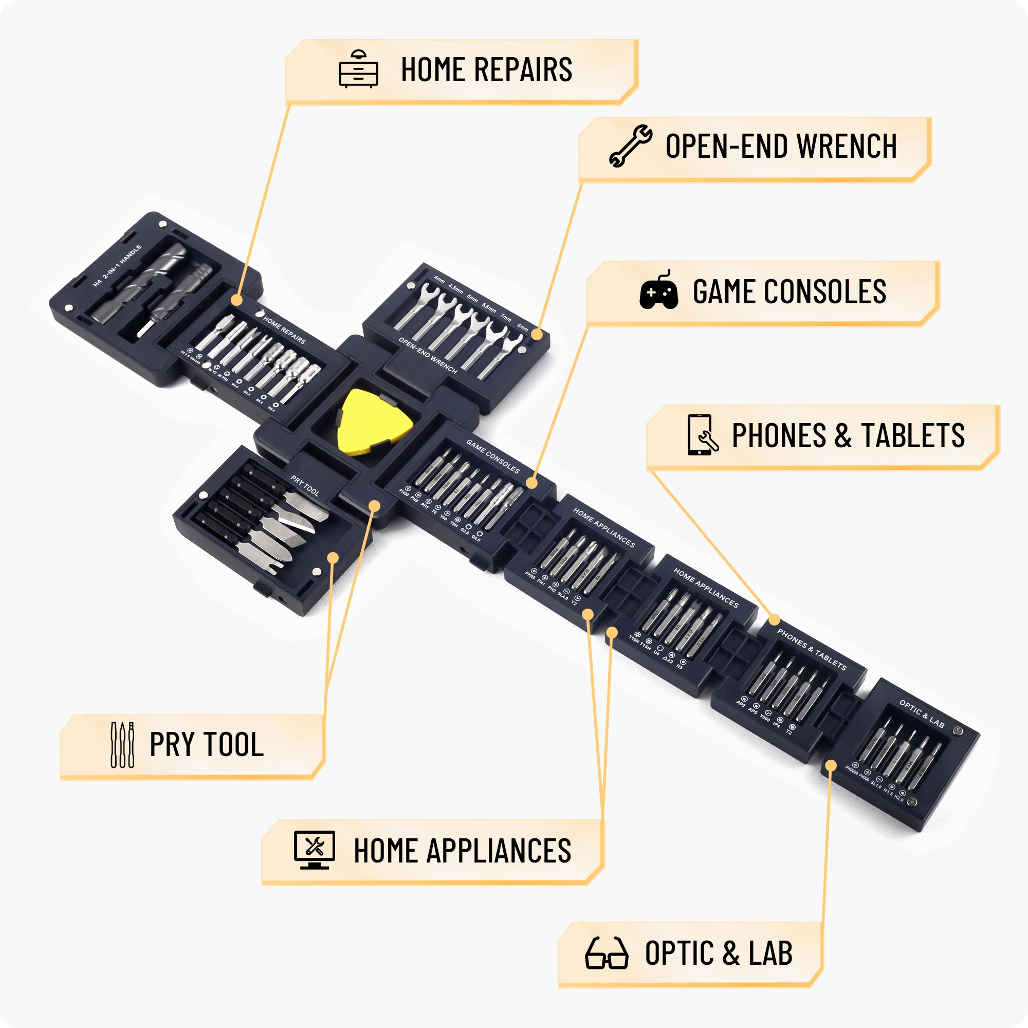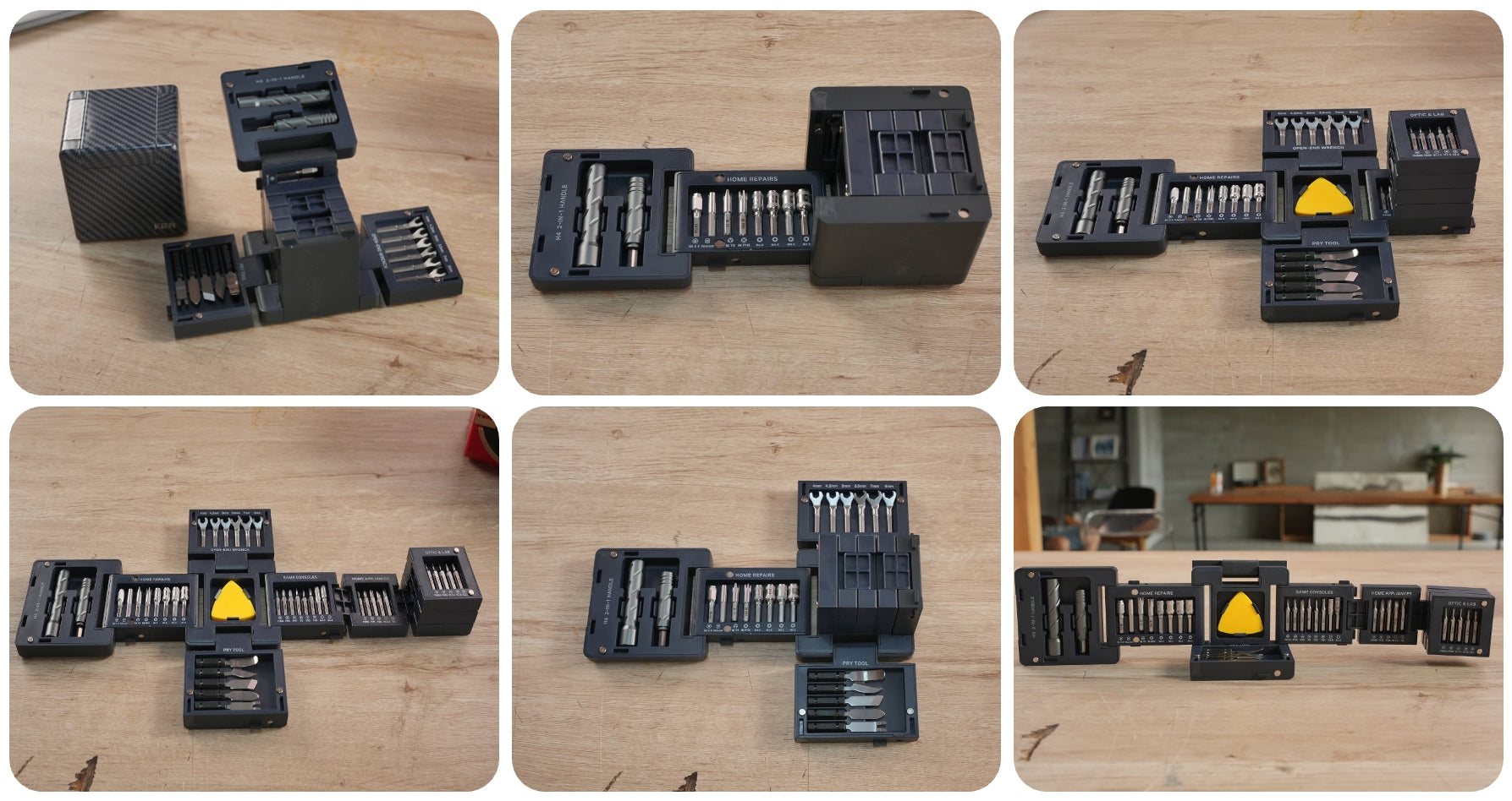 The unfolding design utilizes 100% of the internal volume. By folding the inner panels into the hollow core, it packs a massive, 55-piece toolkit into a pocket-sized cube with zero wasted space.