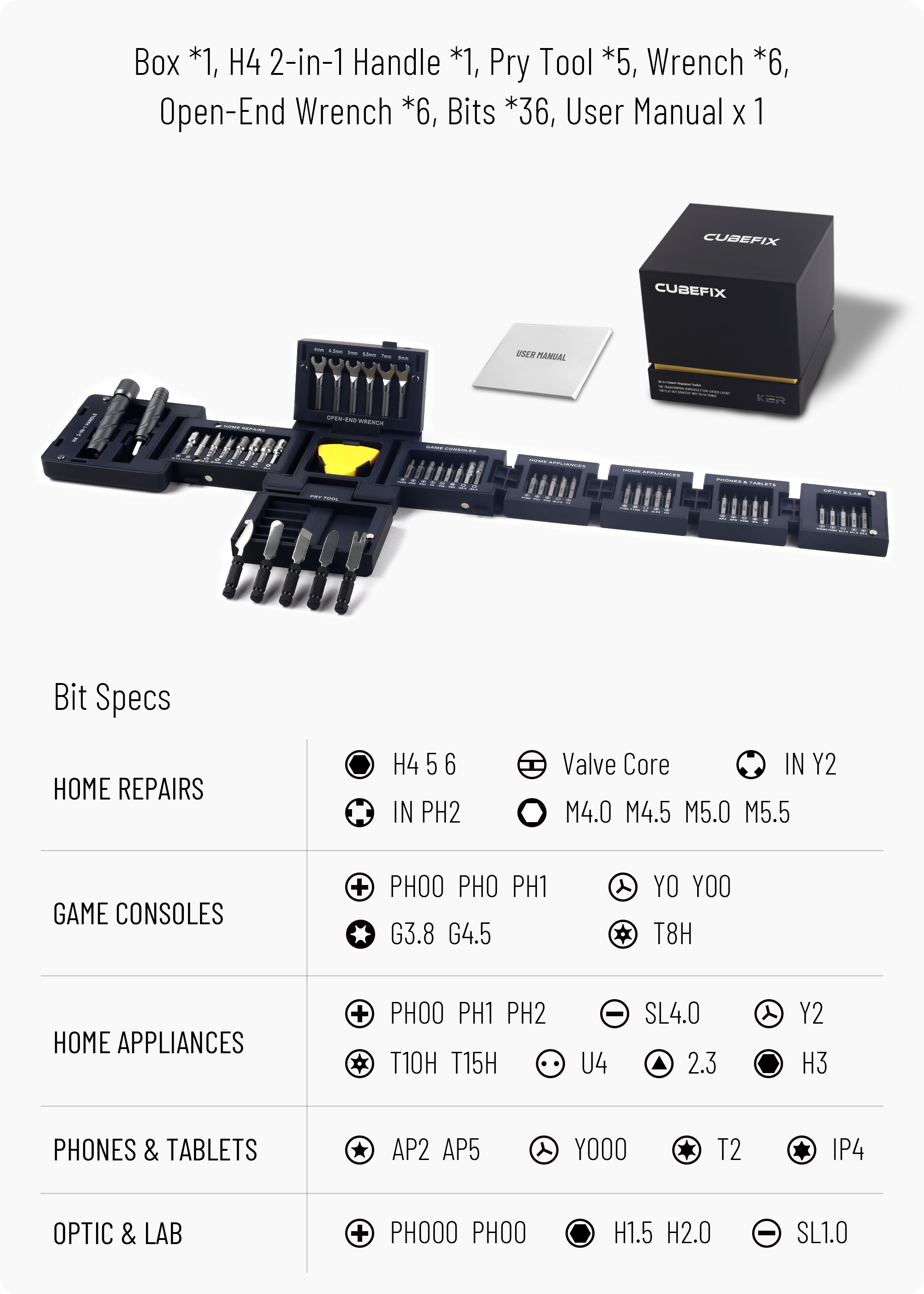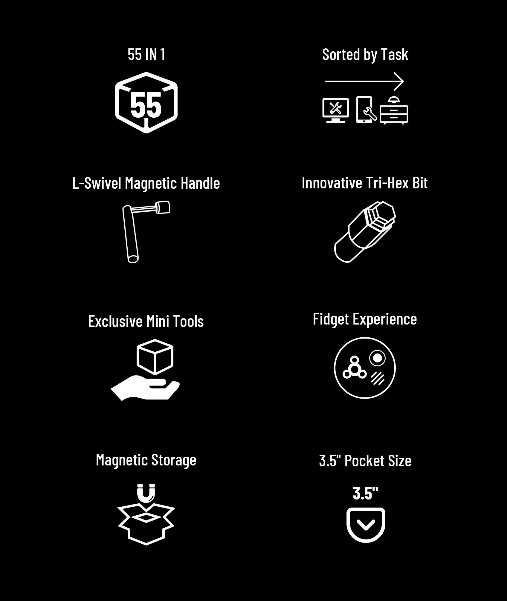 Equipped with the most frequently used bits for household and DIY tasks. 7 categories. 55 tools. We’ve got your back for any daily fix.